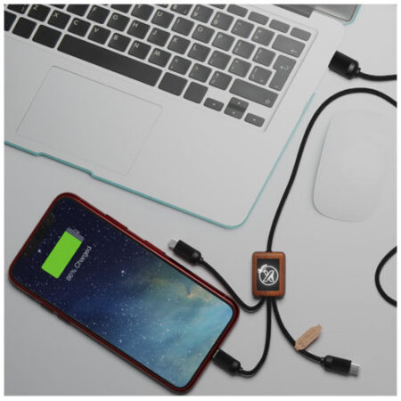 5-in-1 recycled PET light-up logo charging cable with squared bamboo casing. The light-up logo is visible on both sides. Features 3 connectors (type C, micro USB, iPhone) and a dual USB connector for universal use. Delivered in a TPU pouch with a kraft paper card. Cable length: 1 metre. Includes 3 year warranty.