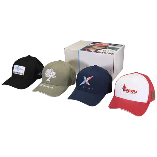 Sample box with 4 caps in different styles: 1 Boston recycled cotton 5 panel cap, 1 Houston recycled cotton 6 panel cap, 1 Arizona recycled cotton 5 panel cap with sandwich visor, and 1 Richmond Aware™ recycled cotton 6 panel cap with sandwich visor.