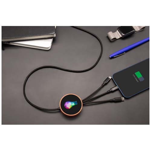5-in-1 recycled PET light-up logo charging cable and 10W bamboo charging pad. Features 3 connectors (type C, micro USB, iPhone) and a dual USB connector for universal use. Delivered in a TPU pouch with a kraft paper card. Cable length: 1 metre. Includes 3 year warranty.