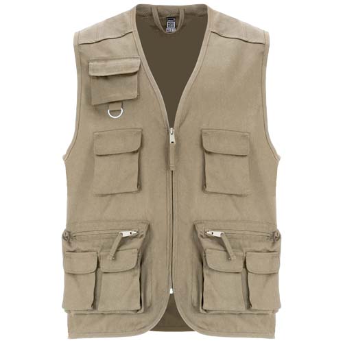 Multi-pocket work vest with v-neck. Front zip with puller. Three chest pockets with flap and hook & loop fastening. Upper pocket with multifunction ring. Two side pockets with zip and puller, with two overlapping pockets with flap and hook & loop fastening. Two back pockets with flap and hook & loop fastening. Neck, armholes and hem with trim.