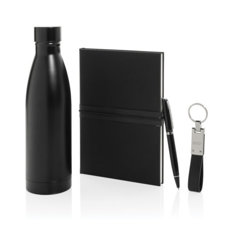 This luxury gift set includes all the essentials you need to get through your workday with comfort and style. The 480 ml double-walled water bottle is made from recycled stainless steel and features vacuum insulation to keep your drinks hot or cold for hours. Thanks to its leak-proof lid, you can carry it with confidence—no spills, no worries.To keep your most important keys always within reach, the set includes a premium Swiss Peak keychain with a glossy metallic finish and a beautifully crafted PU leather strap.Need to capture your ideas on the go? The set also includes a sleek business ballpoint pen with an 1000 metre writing capacity, paired with a soft-touch notebook made from recycled polyester PU. Inside, you’ll find 160 cream-coloured pages made from recycled paper—perfect for jotting down notes, ideas, or to-do lists.All items are RCS certified, ensuring a fully verified supply chain for all recycled materials used.
