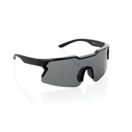 Sport design polarised sunglasses made with RCS certified recycled PC frame. Total recycled content: 50% based on total item weight. RCS certification ensures a completely certified supply chain of the recycled materials. Including recycled RPET sleeve to store the glasses in .The lenses are polarized which eliminates reflecting sunlight, making it ideal for sports and outdoor activities. Conform EN ISO 12312-1, UV 400 and CAT 3. Packed in FSC® gift packaging.