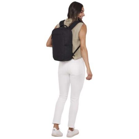 GRS certified backback featuring an open main compartment with organization panel, padded 15″ laptop sleeve, and 2 RFID protection pockets. USB port on the right side to easily connect and charge devices from the interior. Comes with padded shoulder straps, right shoulder strap, hidden zipper pocket, grab handle, and a trolley pass-through. Approximately 15 plastic bottles are recycled to make this bag.