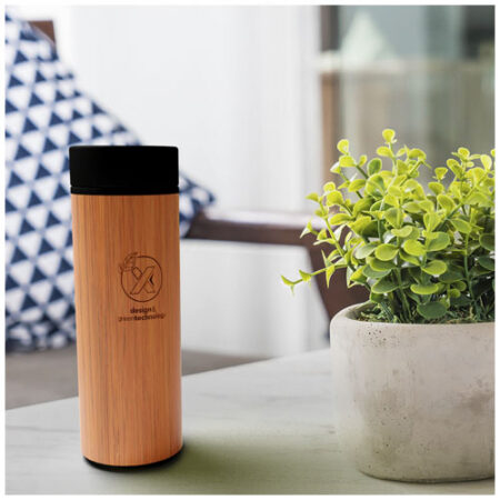 Double-walled vacuum insulated stainless steel and bamboo bottle with a temperature sensor on top of the lid, which displays the temperature of the drink inside the bottle (degrees Celsius). Keeps drinks hot for 8 hours or cold for 12 hours. Comes with a tea filter. Capacity: 500 ml. Delivered in a gift box.