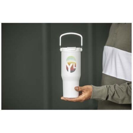 The Bronx 900 ml tumbler is made from RCS certified stainless steel and has a double-walled vacuum construction with copper insulation. Keeps drinks cold for 48 hours or hot for 12 hours. The lid has a dual function with a collapsible straw for easy sipping, and a flip-top opening with a convenient folding handle for effortless portability. Fits most car cup holders. Packed in a recycled cardboard gift box.