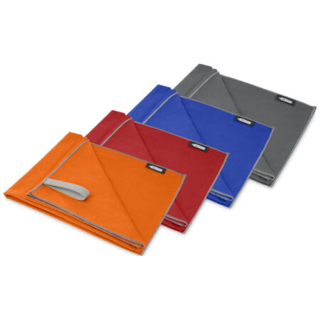 This sport towel absorbs very well, is lightweight and dries quickly. In addition, the fabric is durable and extremely soft. When the towel is folded and secured with the elastic band it’s reduced to a small size, making it suitable for bringing to the gym, swimming pool, or for when going backpacking or camping. The towel has a size of 130 x 80 cm and is made from 200 gr/m2 recycled PET polyamide, and can be washed in the washing machine at 40 °C. Delivered with a storage pouch (20 x 8.5 cm) made from recycled PET plastic, which provides a great area for printing a logo.
