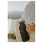 Stainless steel thermos that matches the water bottle coming from the same series. The eyelet on the lid is great for attaching the thermos to the bag and thanks to its shape, it fits most cup holders. Suitable for both hot and cold drinks, keeping the temperature intact for a long time. Easy to clean.