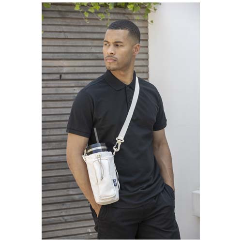 The Trip Aware™ recycled travel bottle bag is a practical and lightweight solution for staying hydrated on the move. Made from 290D twill polyester with a knitted backing and lined with RPET 210D/PU, it offers both durability and considered design. The main compartment features a drawstring closure and fits both large bottles with handles and smaller bottles, with a rear opening for easy access. A front pocket holds essentials such as a phone, and includes an internal slide pocket and a ribbon for securing keys. An adjustable strap and side handle offer flexible carrying options. Each bag also comes with an Aware™ tracer. This innovative feature allows users to trace the origins and journey of their item through a QR code, enhancing transparency in the supply chain and fostering a stronger connection between the product and its production process. Volume capacity: 2 litres.
